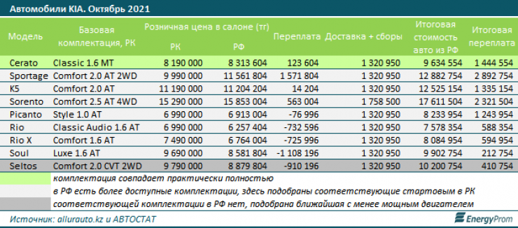 Цены на некоторые модели при пересчёте с рублей в тенге (в расчётах использовался средний курс за октябрь текущего года, данные НБ РК) в автосалонах РФ изначально выше, чем у дилеров в РК. К примеру, идентичные по комплектации Kia Cerato Classic 1.6 MT в РК и в РФ стоят 8,19 миллиона и 8,31 миллиона тенге соответственно, то есть в РК эта модель обходится на 124 тысячи тенге дешевле даже без учёта вопросов доставки и налогов. Что касается, к примеру, модели Sportage Comfort 2.0 AT 2WD, здесь разница цен на автомобили одинаковой комплектации составляет более 1,5 миллиона тенге в пользу РК.