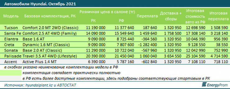 Однако и здесь даже для моделей, стоящих в РФ дешевле, итоговая стоимость "россиян" для казахстанцев будет заметно выше. Так, можно сравнить, к примеру, одинаковые Hyundai Elantra Base 1.6 AT: в РК эта модель стоит 9,09 миллиона тенге, в РФ — 8,73 миллиона тенге, но с учётом налога и доставки стоимость вырастет до 10 миллионов тенге и выше, что уже почти на 1 миллион тенге дороже, чем в РК.