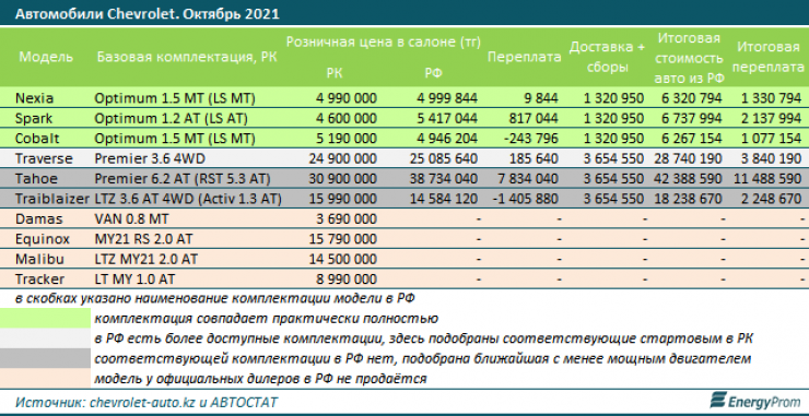 В то же время встречается мнение, что казахстанцам выгоднее покупать автомобили в России. Аналитики Energyprom.kz решили проверить, так ли это. Для этого была проведена сверка цен по трём самым популярным производимым в РК брендам — Kia, Chevrolet и Hyundai. Результаты развеивают мифы.