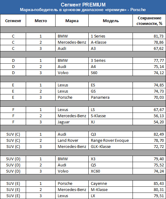 В категории "Премиум" в сегменте "C" первое место занял BMW 1-Series (81,73 процента). Победителем в классе "D" стал BMW 3-Series (77,77 процента). Седан Lexus ES смог сохранить за три года 74,85 процента остаточной стоимости - это лучший показатель в сегменте "E". Первое место в сегменте кроссоверов С-класса заняла Audi Q3 (82,49 процента). Лидерами сегментов SUV (d) и SUV (e) стали BMW X3 (79,40 процента) и Porsche Cayenne (85,43 процента).