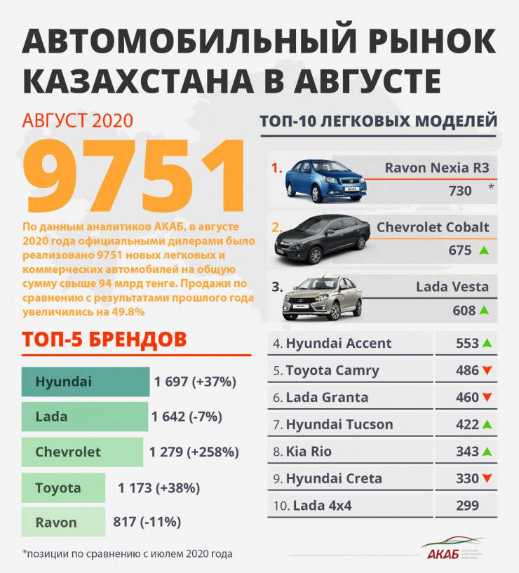 По данным Ассоциации Казахстанского АвтоБизнеса (АКАБ), в августе казахстанские автодилеры продали 8 639 легковых автомобилей и легкой коммерческой техники (+24 процента к показателям июля), а также 1 112 единиц грузовиков и автобусов на общую сумму 94,4 миллиарда тенге. По итогам восьми месяцев 2020 года рынок вырос на 16,4 процента до 53 409 проданных автомобилей (45 901 авто за январь - август 2019 года).