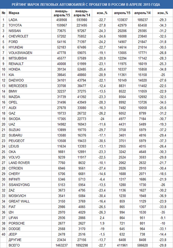 По итогам четырех месяцев 2015 года падение продаж подержанных авто составило 22,7 процента по сравнению с 2014 годом. При этом объем рынка составил 1,5 миллиона автомобилей. Отмечается, что самым популярным подержанным авто в апреле 2015 года в России стала Lada. Всего в прошлом месяце их было продано 133,8 тысячи.