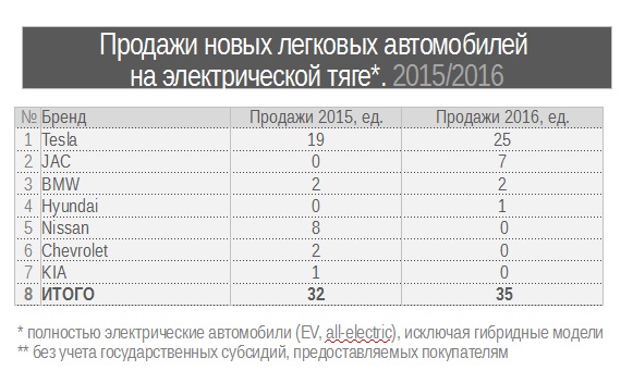 По итогам 2016 года в Казахстане было реализовано 35 новых легковых автомобилей на электрической тяге против 32 проданных годом ранее, сообщает корреспондент Tengrinews.kz со ссылкой на Союз предприятий автомобильной отрасли Казахстана "КазАвтоПром".