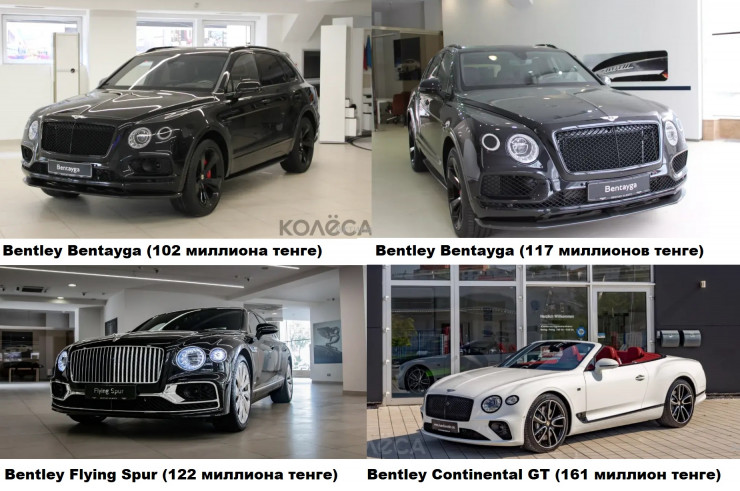 Для состоятельных казахстанцев предлагаются также автомобили британских производителей с немецкой начинкой. Это Bentley Bentayga за 102 и 117 миллионов тенге, модели Bentley Flying Spur и Bentley Continental GT за 122 и 161 миллион тенге, соответственно.