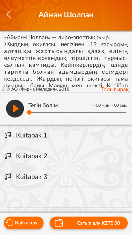 "Қосымшаның заңды түрде шығуын қалап, эпостағы жырларды орындаған және оқыған адамдарға және Кеңес үкіметінде осыларды шығарған "Мелодия" дыбыс жазу студиясының құқықтарын бұзбау үшін, оларға төлемақыларын беру мақсатында қосымшаны толықтай пайдалану ақылы түрде жүзеге асады. Эпостарды толықтай тыңдау үшін қолданушы ең арзан бағамен оларды сатып алуы керек", - дейді бағдарлама жасаушы.