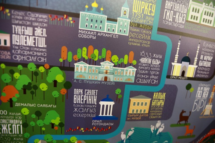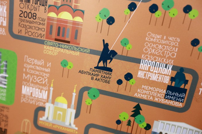 В издание, непривычно большого формата, вошли 19 красочных карт, по одной на каждую область Казахстана и два города республиканского значения. Каждая карта представляет собой содержательную инфографику с интересными фактами о Казахстане, короткими историями о достопримечательностях, местах рождения крупных фигур истории, краснокнижных и просто милых зверях и прочих интересностях страны.