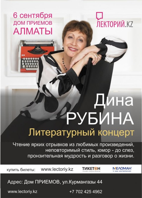 Поэтому приезд Дины Рубиной в Алматы - это подарок не только читателям и поклонникам, но и всем любителям сочного слова, яркого чувства, сильной мысли. "Мои творческие вечера - и это уже знают многие - на самом деле литературные концерты вполне эстрадного стиля. Это авторская программа, в которой сплетены байки и авторское чтение ярких отрывков или маленьких рассказов", - говорит Дина Рубина о своих выступлениях. Также в программе вечера - обязательный разговор с публикой, как всегда без посредников.