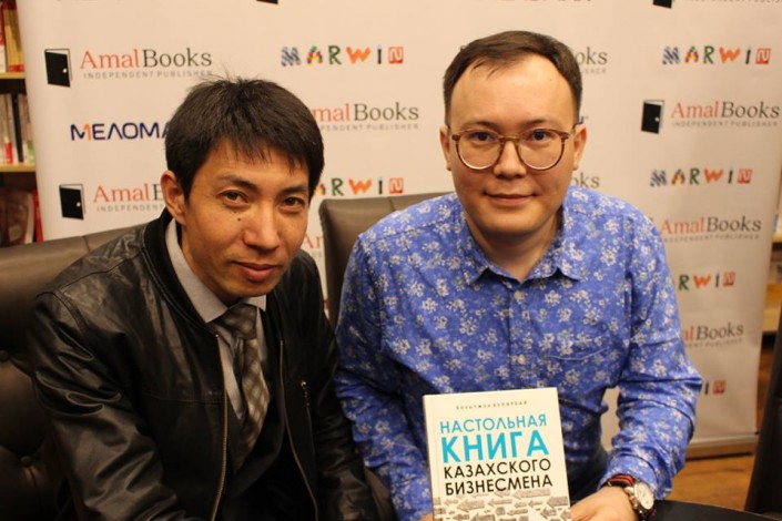 Автор книги Бахытжан Бухарбай (слева) и предприниматель Маргулан Сейсембай (справа) на презентации книги. Фото: Даулет Ашимхан
