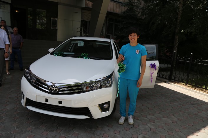 Президент городской федерации по боксу Бакытжан Кажиев подарил девушке новую Toyota Corolla, а ее личному тренеру Жумабеку Омирзакову за подготовку чемпионки вручил денежное вознаграждение.