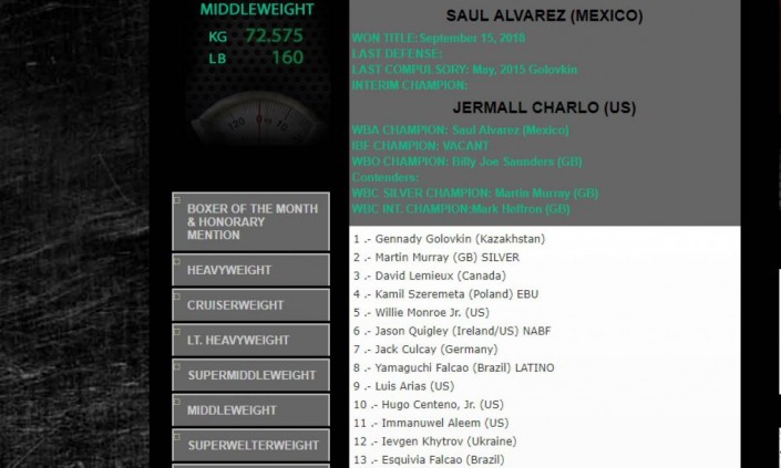Пояс чемпиона в среднем весе по версии этой организации принадлежит мексиканцу Саулю "Канело" Альваресу. Обязательным претендентом является американец Джермалл Чарло.