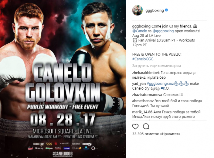 "Присоединяйтесь к нам, друзья! Открытые тренировки GGG и "Канело" 28 августа в LA Live. Прибытие зрителей с 10.30, начало тренировок с 12.00. Вход свободный", - говорится в сообщении.