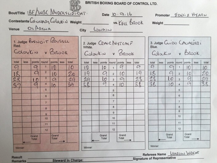 Промоутер Эдди Хирн опубликовал фото судейских записок боя между Геннадием Головкиным и британцем Келлом Бруком, сообщают Vesti.kz.