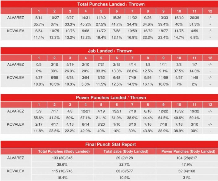 Всего за поединок, согласно статистике, мексиканец выбросил в сторону соперника 345 ударов, донеся до цели 133 из них, что составляет 38,6 процента точности. Россиянин же пробил в сторону Канело 745 раз, но попал в цель лишь в 115 случаях, таким образом, его точность ударов составила лишь 15,4 процента. 577 ударов Ковалева из 745 пришлись на джебы, а оставшиеся 168 были силовыми.