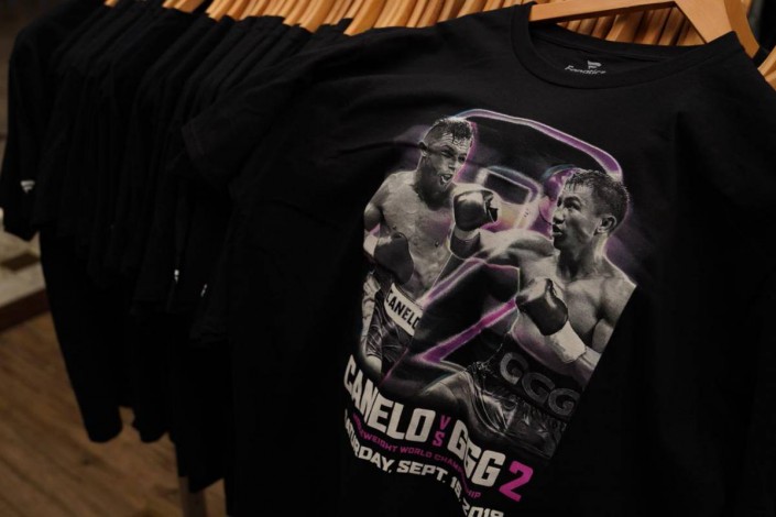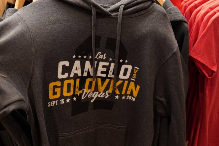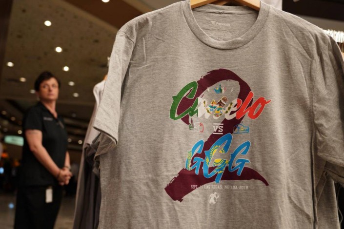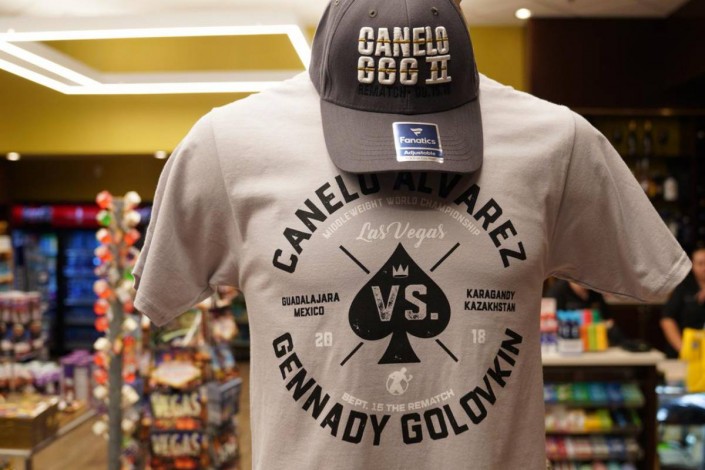 Фирменная атрибутика, посвященная предстоящему рематчу между чемпионом мира в среднем весе казахстанцем Геннадием Головкиным и мексиканцем Саулем "Канело" Альваресом, поступила в продажу в Лас-Вегасе, передает Tengrinews.kz со ссылкой на Vesti.kz.