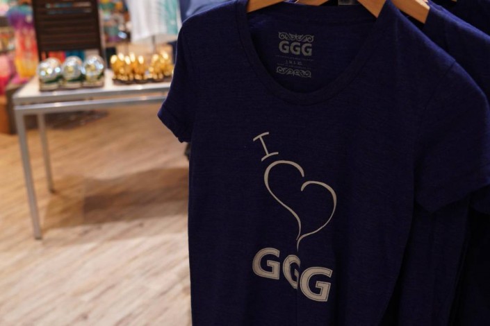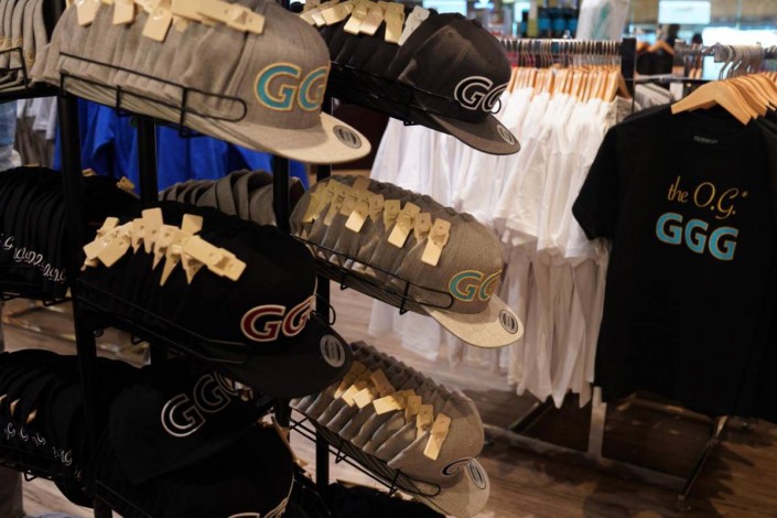 В прошлом году именно они, с тремя буквами GGG, стали самым ходовым товаром и были раскуплены еще до дня боя. Поэтому данной атрибутике, посвященной Головкину, в этот раз гораздо больше.