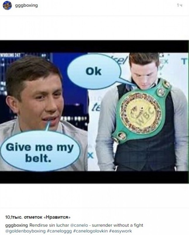Непобежденный казахстанский боксер Геннадий Головкин на своей странице в Instagram потроллил мексиканца Сауля "Канело" Альвареса, который накануне отказался от пояса чемпиона WBC, после чего данный титул без боя перешел к Головкину.