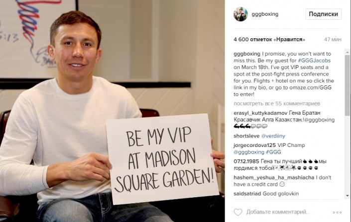 Казахстанский боксер Геннадий Головкин обратился к своим поклонникам перед боем с американцем Дэниэлом Джейкобсом, предложив им VIP-места на поединок, а также перелет и проживание в отеле за его счет.