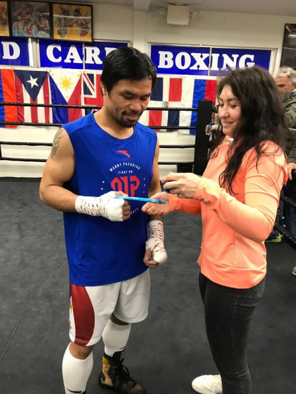 Девушка-боксер из Казахстана Аида Сатыбалдинова встретилась в Лос-Анджелесе со звездой мирового бокса филиппинцем Мэнни Пакьяо и преподнесла ему презенты. Об этом спортсменка написала на своей странице в Instagram.