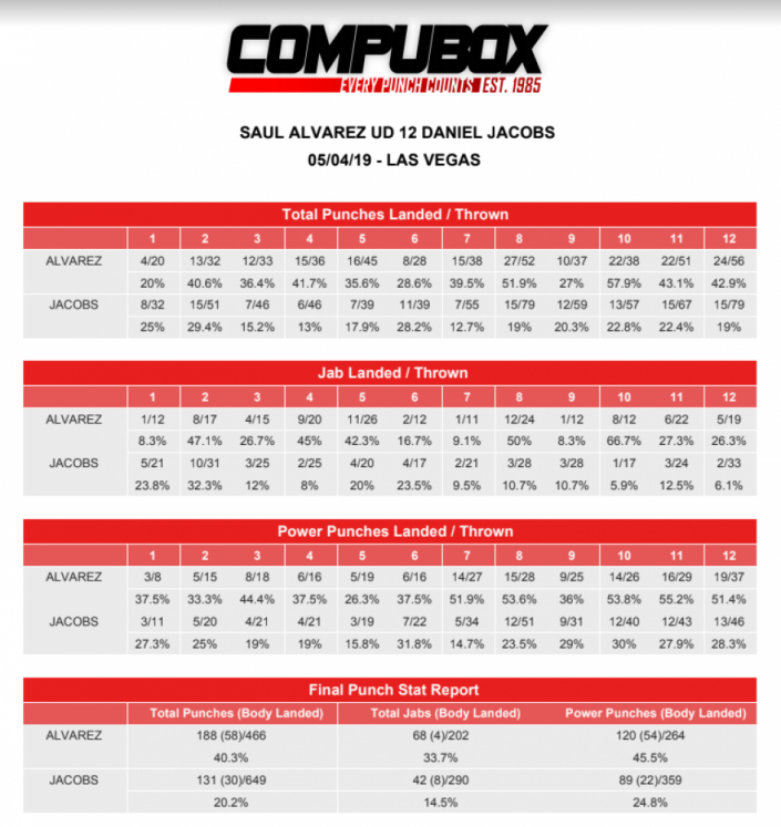 За 36 минут боя Джейкобс выбросил в полтора раза больше ударов - 649 против 466, но точнее был Альварес - 188 против 131 (40,3 процента против 20,2). В четырех из пяти последних раундов мексиканец попадал точно больше 20 раз, а у американца в этот промежуток больше 15 попаданий не было. Уступил Джейкобс и по силовым ударам - 89 против 120.
