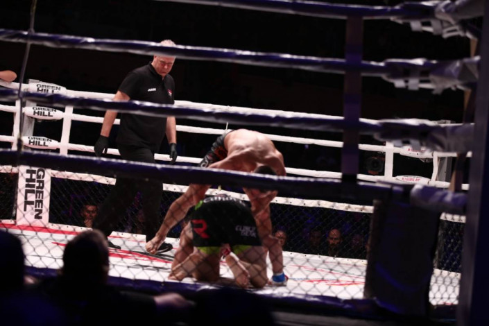 В первом раунде казахстанец перебил конкурента, а во втором - чуть его не задушил. Он одержал победу единогласным решением судей. Эффектно выглядел в одном из эпизодов бросок с прогибом из мира классической борьбы. Не помешала Ассу и желтая карточка, предъявленная за удержание канатов.
