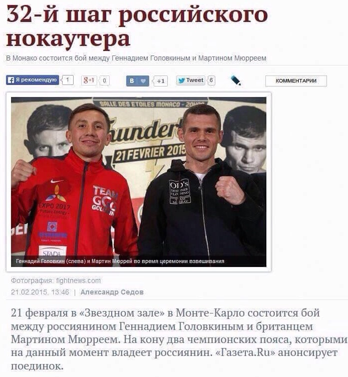 "21 февраля в "Звездном зале" в Монте-Карло состоится бой между россиянином Геннадием Головкиным и британцем Мартином Мюрреем. На кону два чемпионских пояса, которыми на данный момент владеет россиянин", - написало издание. Далее в анонсе боя также несколько раз упоминается о "российском боксере". Статью с оригинальным заголовком перепечатали несколько сайтов. Однако позже "Газета.Ru" изменила название статьи и признало в Головкине казахстанца.