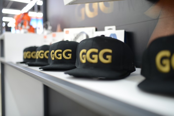Бренд-зона представляет собой товары с футболками и кепками с логотипом GGG.
