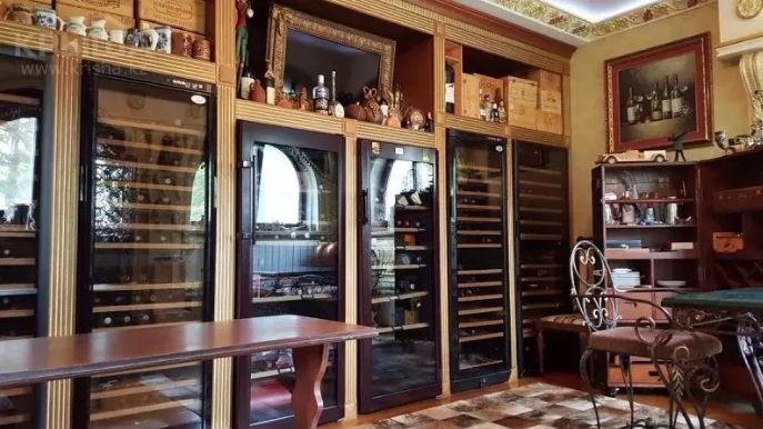 На первом этаже есть сауна (финская и русская бани), комната отдыха и ожидания для рабочего персонала, винный погреб, малый зал, кухонная зона, комнаты для персонала. На втором этаже находятся гостиная, занимающая 70 квадратных метров, три спальни и детская.