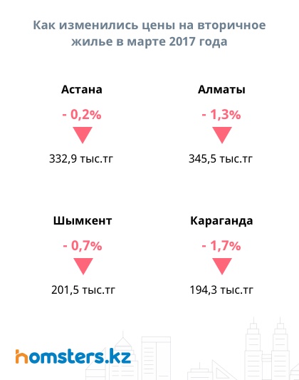 По данным аналитического центра онлайн-сервиса для покупателей недвижимости Homsters.kz, снижение цен на жилье было неравномерным. Так, например, в Астане цены снизились на 0,2 процента, до 332,9 тысячи тенге, в Алматы - 1,3 процента, до 345,5 тысячи тенге, в Шымкенте - 0,7 процента, до 201,5 тысячи тенге, в Караганде - 1,7 процента, до 194,3 тысячи тенге за 1 квадратный метр.