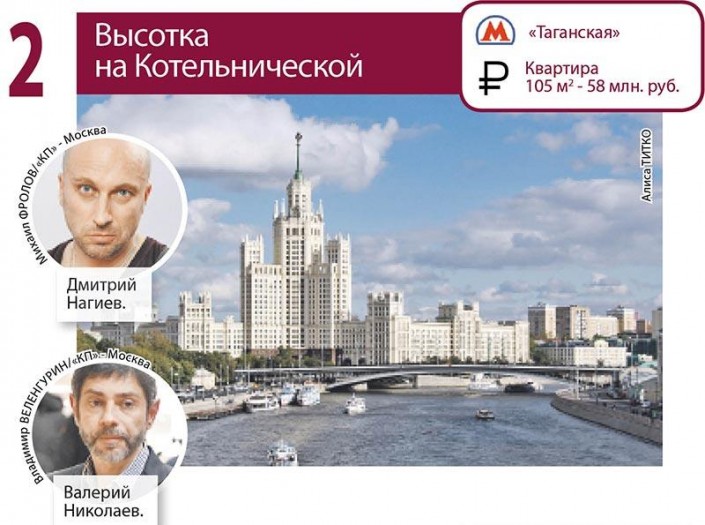 В знаменитой высотке на Котельнической набережной еще в советские времена жила элита: Галина Уланова, Александр Твардовский, Василий Аксенов, Андрей Вознесенский, Фаина Раневская, Людмила Зыкина. Сейчас квартиры в высотке есть у Вилли Токарева, Дмитрия Нагиева, Андрея Кайкова, Валерия Николаева, Александра Ширвиндта.