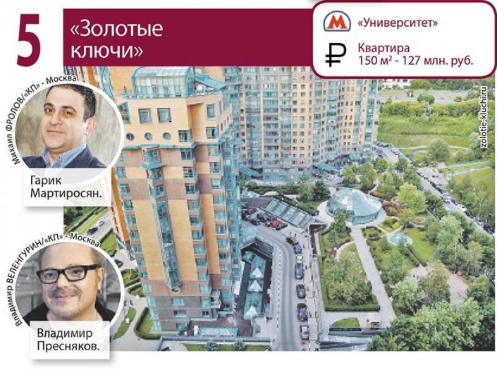 В ЖК "Золотые ключи" и "Золотые ключи-2" квартиры есть у Гарика Мартиросяна, Владимира Преснякова, Елены Воробей, Тимати. Дома комплекса стоят в пойме реки Раменки, во дворе есть пруд, цветники, альпийские горки, теннисные корты, спа и фитнес-центры.
