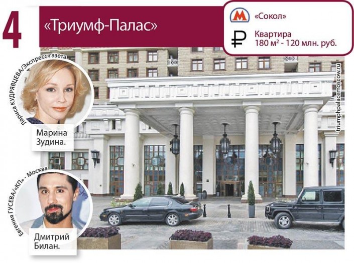 Так, в ЖК "Триумф-Палас" в Чапаевском переулке живут Алсу, Илья Авербух, певица МакSим, Дима Билан, Максим Фадеев и другие.