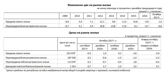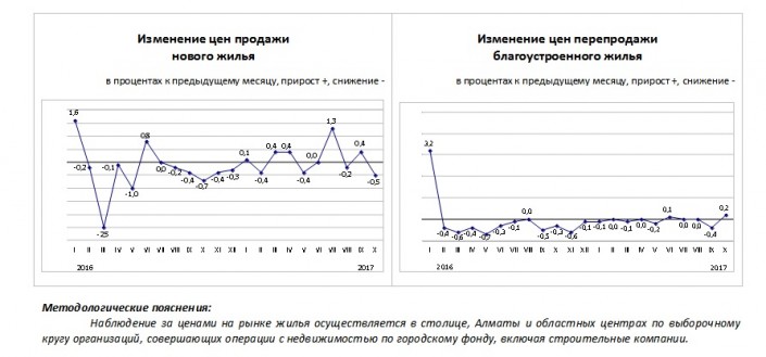 В октябре 2017 года цены продажи нового жилья снизились, а перепродажи благоустростроенного и неблагоустроенного - повысились, передает Tengrinews.kz со ссылкой на пресс-службу Министерства национальной экономики РК.