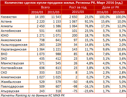 "Даже в январе, когда по всей стране отмечался традиционный сезонный спад, в обоих мегаполисах был зафиксирован рост сделок на 25 процентов. В число лидеров в марте также вошли Актюбинская (+23 процента), ЮКО (+19 процентов), Акмолинская и Кызылординская (+15 процентов), а также Карагандинская (+12 процентов) области", - говорится в распространенном сообщении.