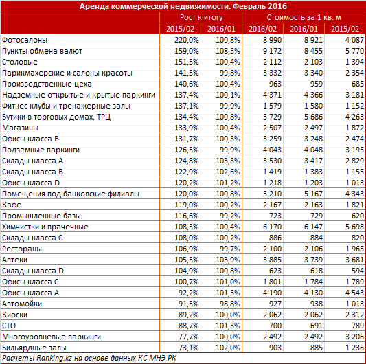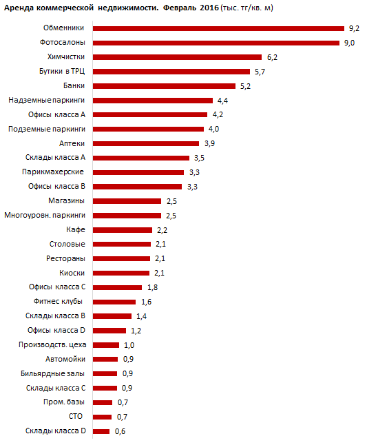 При этом абсолютными фаворитами рынка как по размеру арендной платы, так и по темпам ее роста за год, стали помещения под фотосалоны и обменные пункты. Цена на аренду таких помещений за год выросла в 2,2 и 1,6 раза соответственно. В феврале аренда квадратного метра такой недвижимости обходилась в среднем в 9000 тенге.