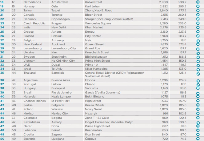 В этот список вошли улицы Гоголя, Фурманова и Кабанбай батыра. Все три названные улицы входят в "золотой квадрат" южной столицы. Отмечается, что в 2013 году эти улицы находились на 40-й строчке рейтинга, а сейчас заняли 46-ю позицию. Соседями Казахстана по арендной ставке торговых площадей стали Колумбия (45 место) и Катар (47 место).