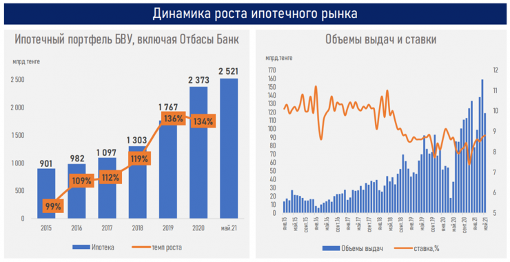 • несмотря на растущие объемы выдачи  ипотеки в январе-мае текущего года (592 миллиарда тенге против 216,3 миллиарда за 5 месяцев 2020 года и 270 миллиардов за 5 месяцев 2019 года), темпы роста ипотечного портфеля снижаются за счет существенного объема погашений (483 миллиарда тенге), осуществляемых в рамках досрочного изъятия пенсионных накоплений;