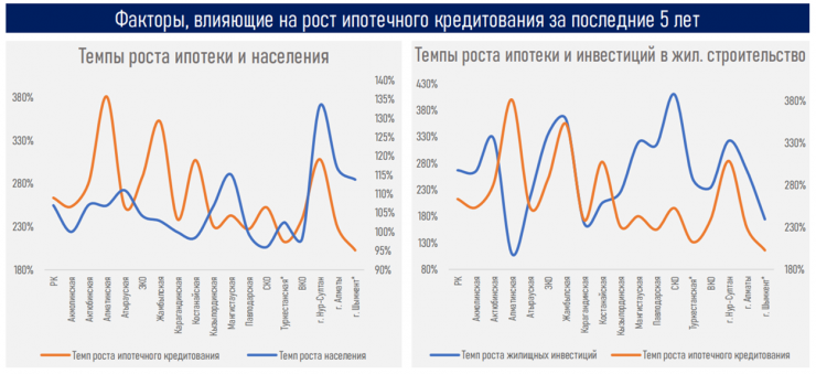 По данным аналитиков, регионы страны имеют неравномерное распределение в портфеле ипотеки, демонстрируя высокую концентрацию в крупных городах - Нур-Султан и Алматы - 52 процента рынка. Четверть рынка ипотеки приходится на Мангистаускую, Актюбинскую, Восточно-Казахстанскую и Карагандинскую области и город Шымкент; в портфеле на долю областей приходится от 4 до 6 процентов. Темпы роста ипотечного кредитования в данных регионах и городах достигали от 23 до 48 процентов в 2020 году.