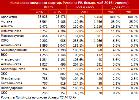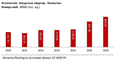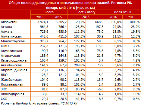 "При этом, как и годом ранее, столица продолжает удерживать лидирующие позиции по вводу зданий в эксплуатацию (за январь-май 2016 года). Было введено более 900 тысяч квадратных метров жилья. Второе место занимает Алматы (введено более 700 тысяч квадратных метров.), также высоки доли Алматинской области и Мангыстау. Всего в Казахстане с января по май было введено почти 4 миллиона квадратных метров жилья, что на 20 процентов больше, по сравнению с аналогичным периодом прошлого года. Количество введенных квартир составило 33 938, из них индивидуальными застройщиками 13 682 единицы", - говорится в распространенном сообщении.