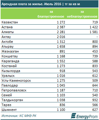 В свою очередь, арендная плата за жилье по итогам июля составляла в среднем по РК 1 272 тенге за квадратный метр благоустроенного жилья и 719 тенге за квадратный метр неблагоустроенного. "Дороже всего аренда благоустроенной жилплощади обходилась жителям столиц - 2 387 тенге за квадратный метр для Астаны и 2 281 тенге - для Алматы", - подытожили аналитики.
