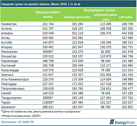 "На вторичном рынке квадратный метр благоустроенного жилья стоил по итогам июля 191,3 тысячи тенге (плюс 11,9 процента за год), неблагоустроенного - 115,5 тысячи тенге (плюс 14,9 процента), элитного - 206,7 тысячи тенге (плюс 8,5 процента)", - отметили специалисты, пояснив, что благоустроенное жилье стоило дороже всего в Актау (342,1 тысячи тенге за квадратный метр), неблагоустроенное - в Астане (206,1 тысячи тенге за квадратный метр), элитное - в Алматы (442,6 тысячи тенге).