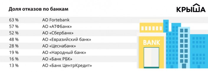 Наименьшая доля отказов характерна для Костанайской (18 процентов) и Акмолинской (20 процентов) областей, Астаны (22 процента).