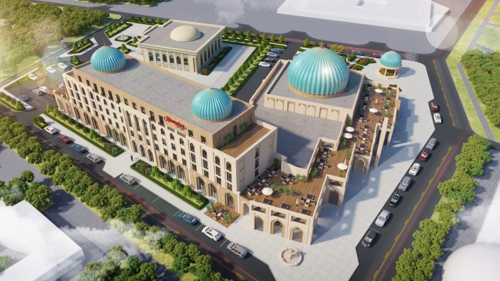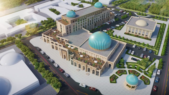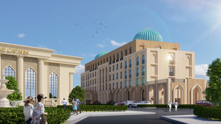 Отель расположится в историческом центре города. Из его окон откроется вид на мавзолей Ходжи Ахмета Яссауи – памятник истории и культуры, включенный в список Всемирного наследия ЮНЕСКО. Также в шаговой доступности будут расположены основные туристические и культурные достопримечательности одного из самых посещаемых туристами городов Казахстана. Кроме того, на прилегающей к отелю территории будет построен дворец бракосочетаний.