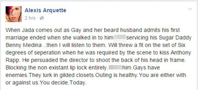 Американская актриса-трансгендер Алексис Аркетт назвала Уилла Смита и его жену Джаду Пинкетт-Смит ханжами и лицемерами, так как те, по ее словам, являются гомосексуалистами, однако тщательно это скрывают. Об этом Аркетт написала на своей странице в Facebook