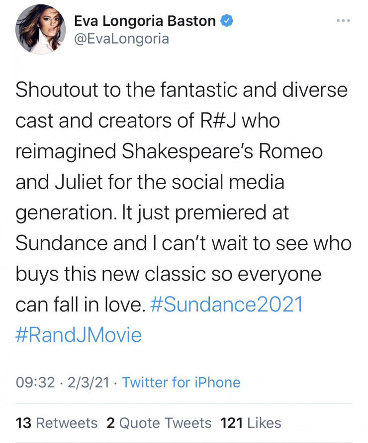 "Браво фантастическому и разнообразному касту (подбор актеров - прим. автора) фильма R#J и его создателям, которые переосмыслили "Ромео и Джульетту" Шекспира для поколения соцсетей. Фильм только что представили на фестивале "Сандэнс", и мне не терпится узнать, какая из платформ купит его, чтобы зрители могли насладиться этой новой работой", - написала она у себя на странице в Twitter.