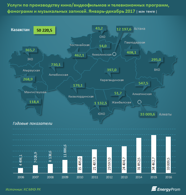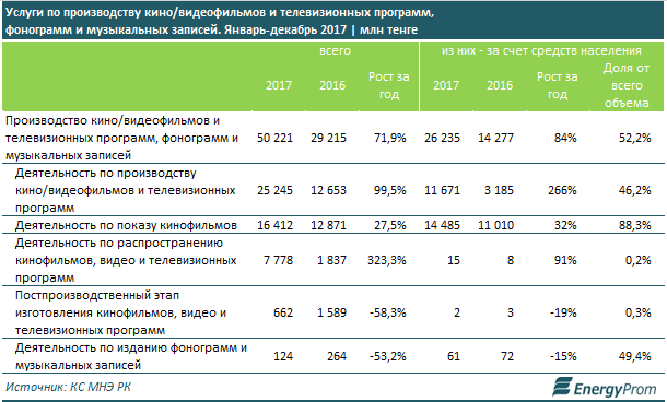 За январь-декабрь 2017 года объем услуг по производству кино/видеофильмов, а также телевизионных программ, фонограмм и музыкальных записей составил уже 20,2 миллиарда тенге - сразу на 71,9 процента больше, чем годом ранее.