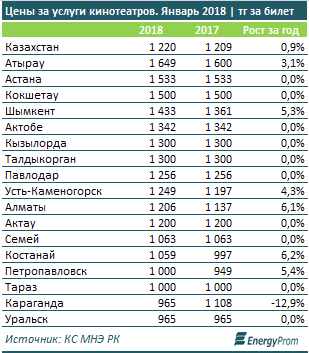 Средняя стоимость билетов в кино в Казахстане по итогам января 2018 года выросла на 0,9 процента и составила 1 220 тенге, передает корреспондент Tengrinews.kz со ссылкой на исследование energyprom.kz.