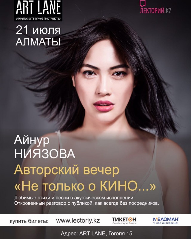 21 июля Лекторий.kz приглашает казахстанцев на откровенный разговор с актрисой, певицей, сценаристом Айнур Ниязовой, передает корреспондент Tengrinews.kz. В программе вечера - любимые стихи и песни в акустическом исполнении, а также откровенный разговор с публикой без посредников. Авторский вечер пройдет в ART Lane в 19.00.
