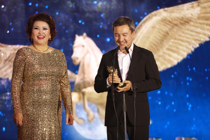 Награду за выдающийся вклад в казахстанский кинематограф получил Асанали Ашимов. Статуэтку "Тулпар" вручила народная артистка Айман Мусаходжаева.