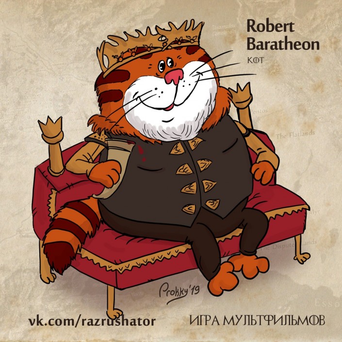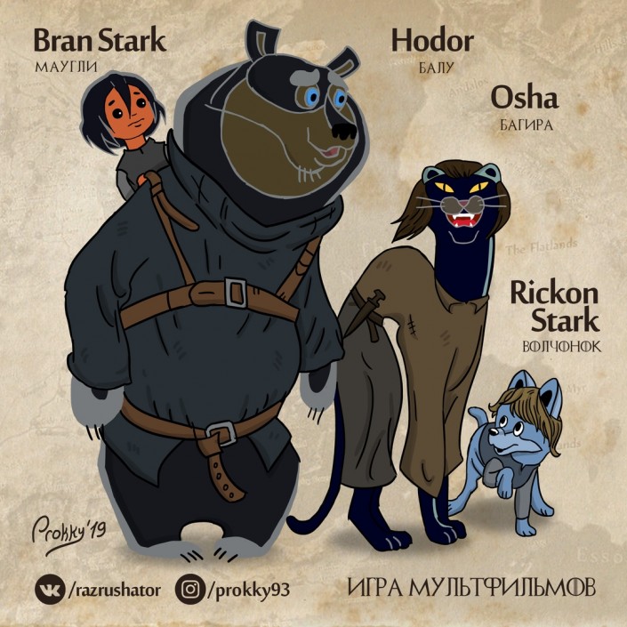 Художник изобразил Зайца и Волка из "Ну, погоди!" в образах Арьи Старк и Сандора Клигана, Малыш и Карлсон из одноименного мультфильма превратились в Джоффри Баратеона и Тириона Ланнистера, Винни Пух стал Сэмвеллом Тарли, Пятачок - Джоном Сноу. Чебурашка в исполнении автора примерил на себя роль Дейенерис Таргариен с драконом-Геной.