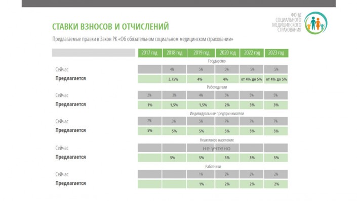 С 1 января 2018 года начинает платить государство за 14 льготных категорий граждан (по предварительным оценкам речь идет о более чем десяти миллионах граждан). Если в действующем законе ставка государства была 4 процента, то в предложенных поправках (сейчас находятся в Парламенте - прим. автора) ставка снижается до 3,75 процента от среднемесячной зарплаты за два предшествующих года, с 2019 года она увеличивается до 4 процентов и с 2022 года ставка должна устанавливаться в диапазоне от 4 до 5 процентов. Конкретный размер будет установлен законом о республиканском бюджете на соответствующий год.